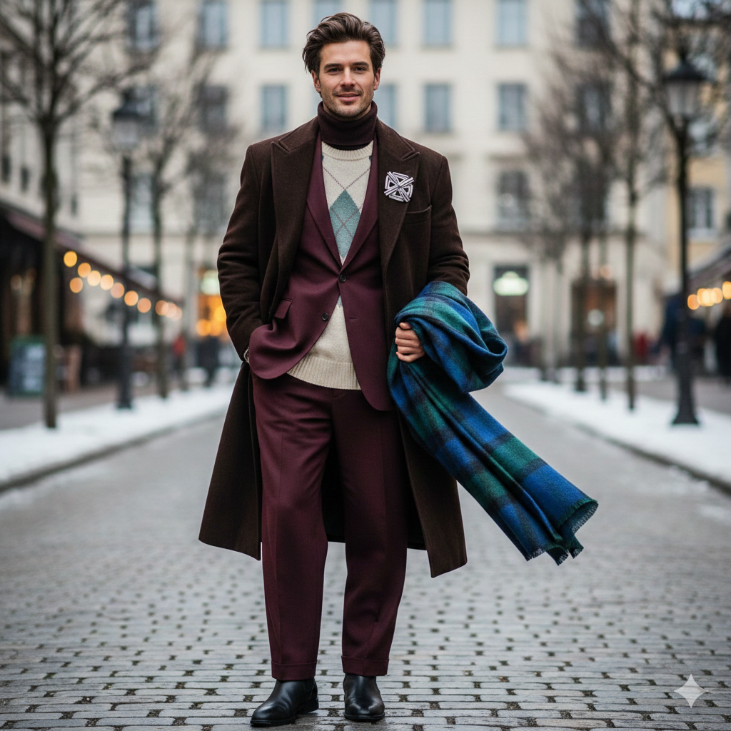 الكنزات الصوفية الضخمة (Chunky Knits): عودة النقشات الكلاسيكية مثل الأرجيل (Argyle) والمربعات الاسكتلندية (Tartan).